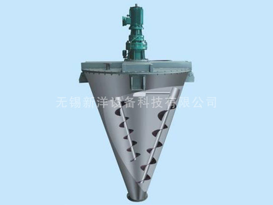 立式混合機(jī),它由傳動(dòng)部分、筒蓋、螺旋、筒體、出料閥等組成。