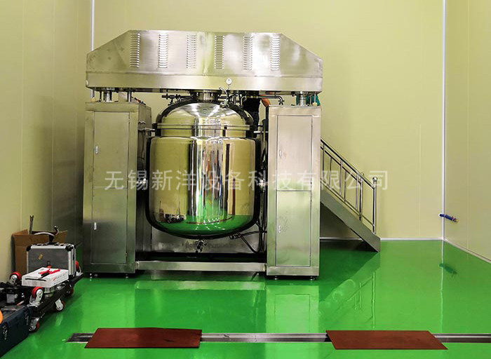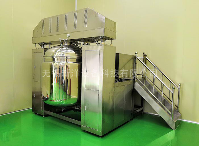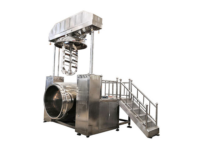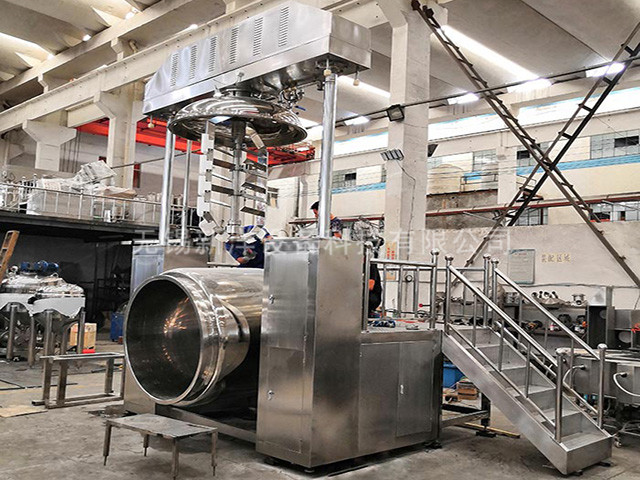 物料在水鍋、油鍋內(nèi)通過加熱、攪拌進行混合反應(yīng)后,由真空泵吸入乳化鍋,通過乳化鍋內(nèi)上部的中心攪拌、聚四氟乙烯刮板始終迎合攪拌鍋形體,掃凈掛壁粘料,使被刮取的物料不斷產(chǎn)生新界面,再經(jīng)過葉片的剪斷、壓縮、折疊,使其攪拌、混合而向下流往鍋體下方的均質(zhì)器處,物料再通過高速旋轉(zhuǎn)的切割輪與固定的切割套之間所產(chǎn)生的強力的剪斷、沖擊、亂流等過程,物料在剪切縫中被切割,迅速破碎成200um-0.2um的微粒,由于乳化鍋內(nèi)處于真空狀態(tài),物料在攪拌過程中產(chǎn)生的氣泡被及時抽走。采用抽真空的方式,使所生產(chǎn)的制品在攪拌過程中不再混入氣泡,從而保證可制造出富有光澤、細膩及延展性良好的產(chǎn)品。
