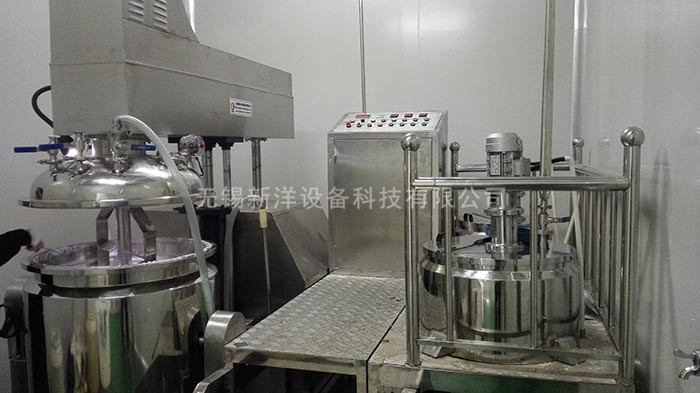 物料在水鍋、油鍋內(nèi)通過加熱、攪拌進(jìn)行混合反應(yīng)后,由真空泵吸入乳化鍋,通過乳化鍋內(nèi)上部的中心攪拌、聚四氟乙烯刮板始終迎合攪拌鍋形體,掃凈掛壁粘料,使被刮取的物料不斷產(chǎn)生新界面,再經(jīng)過葉片的剪斷、壓縮、折疊,使其攪拌、混合而向下流往鍋體下方的均質(zhì)器處,物料再通過高速旋轉(zhuǎn)的切割輪與固定的切割套之間所產(chǎn)生的強(qiáng)力的剪斷、沖擊、亂流等過程,物料在剪切縫中被切割,迅速破碎成200um-0.2um的微粒,由于乳化鍋內(nèi)處于真空狀態(tài),物料在攪拌過程中產(chǎn)生的氣泡被及時(shí)抽走。采用抽真空的方式,使所生產(chǎn)的制品在攪拌過程中不再混入氣泡,從而保證可制造出富有光澤、細(xì)膩及延展性良好的產(chǎn)品。