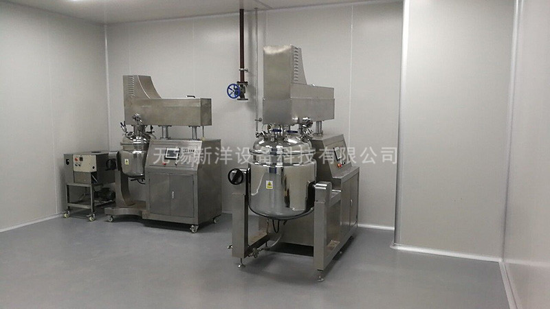 物料在水鍋、油鍋內(nèi)通過加熱、攪拌進(jìn)行混合反應(yīng)后,由真空泵吸入乳化鍋,通過乳化鍋內(nèi)上部的中心攪拌、聚四氟乙烯刮板始終迎合攪拌鍋形體,掃凈掛壁粘料,使被刮取的物料不斷產(chǎn)生新界面,再經(jīng)過葉片的剪斷、壓縮、折疊,使其攪拌、混合而向下流往鍋體下方的均質(zhì)器處,物料再通過高速旋轉(zhuǎn)的切割輪與固定的切割套之間所產(chǎn)生的強力的剪斷、沖擊、亂流等過程,物料在剪切縫中被切割,迅速破碎成200um-0.2um的微粒,由于乳化鍋內(nèi)處于真空狀態(tài),物料在攪拌過程中產(chǎn)生的氣泡被及時抽走。采用抽真空的方式,使所生產(chǎn)的制品在攪拌過程中不再混入氣泡,從而保證可制造出富有光澤、細(xì)膩及延展性良好的產(chǎn)品。